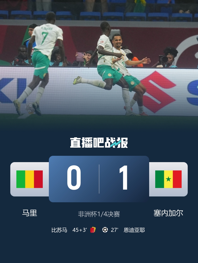 塞内加尔半决赛将战埃及/科特迪瓦胜者!恩迪亚耶制胜,比苏马半场两黄变一红。